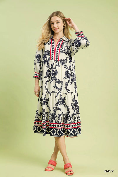 This boho print tiered midi dress is a gorgeous addition to your bohemian-inspired wardrobe. The flowy tiered silhouette creates a relaxed and free-spirited vibe, perfect for a laid-back summer look. The split neckline with contrast detailing adds a unique and stylish element to the dress. With a flattering midi length, this dress is versatile for various occasions and can be dressed up or down effortlessly. Complete with placket detail and lined for comfort, this dress is both fashionable and practical for your wardrobe.